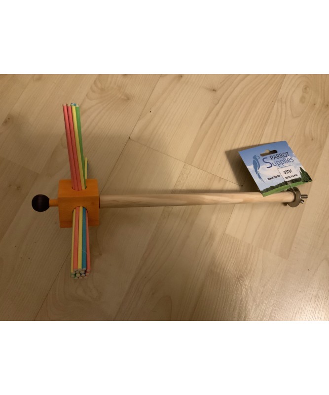 Using the wood perch as their vantage point, your Parrot can have fun spinning the wooden block around with coloured chew sticks, then work at removing them before unravelling them and chewing it to pieces, all before giving you that satisfying look.