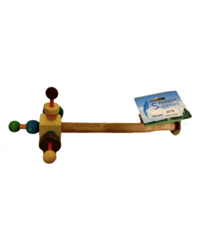Natural wood perch with a colourful wooden spinning toy at the end.