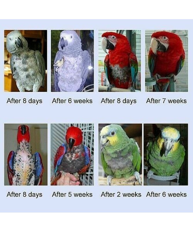 Greys, Macaws and small birds have totally feathered up in only a matter