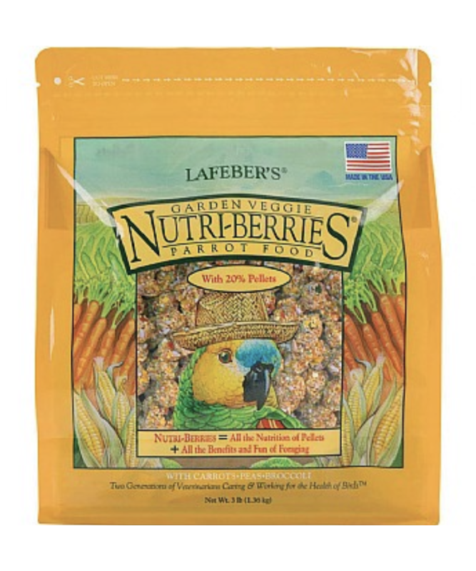 Lafeber NutriBerries Garden Veggie contains only nutritious, natural ingredients including crunchy carrots, peas and broccoli, rolled into berry shaped pieces and coated with vitamins and minerals.