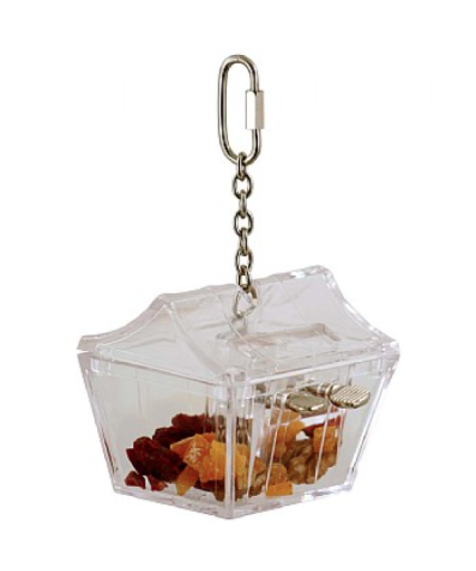 Teach your bird to turn and pull the keys to unlock the treasure chest shaped toy to make the bottom drop and reveal the hidden treasure!