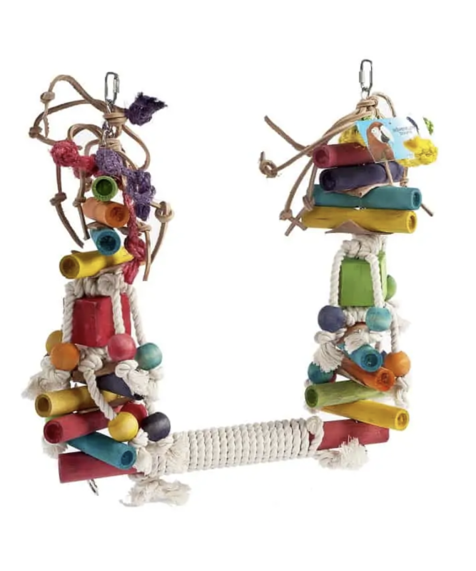 The Adventure Bound Toys Jumble Stack Swing Parrot toy is suitable for Medium Parrots, e.g. African Greys, Large Parrots, e.g. Macaws and other similar sized birds.