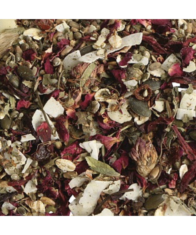 Composition: Barley Flakes, Coconut Chips, Dandelion Leaf, Dried Edible Rose Petals *(non-Organic), Flaked Almonds, Ground Linseed, Hemp Seeds, Hibiscus Flower, Milk Thistle Seed, Pumpkin Seeds, Red Clover Flower, Rosehips, Spearmint, White Hulled Sesame Seeds