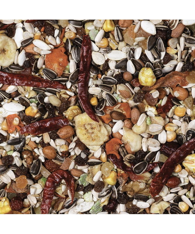 Medium Striped Sunflower Seed, Natural Groats, White Sunflower Seed, Whole Maize, Jumbo Peanuts, Safflower Seed, Flaked Peas, Puffed Maize, Currants, Banana Chips, Chillies, Vegetable Oil, Peanuts, Pumpkin Seed, Diced Apricots, Pine Nuts, Melon Dice, Dried Carrot Rings, Walnut Halves, Diced Pineapple, Brazil Nut Kernels, Whole Rosehips