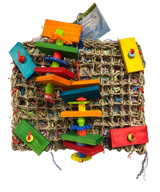 The huge woven seagrass has hundreds of strands for your Parrot to pick and preen. Colourful plastic shapes and wood blocks are knotted on with rope for your bird to enjoy chewing and unravelling; helping to keep your bird’s beak and brain active and healthy.