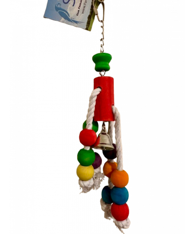 This Miami-Dade Wood Parrot Toy by Parrot-Supplies has coloured wood balls stacked together. All the parts are held on a cotton rope
