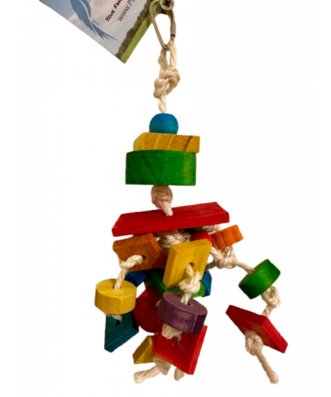 This Pinellas Wood Parrot Toy by Parrot-Supplies has coloured wood balls stacked together. All the parts are held on a sisal rope
