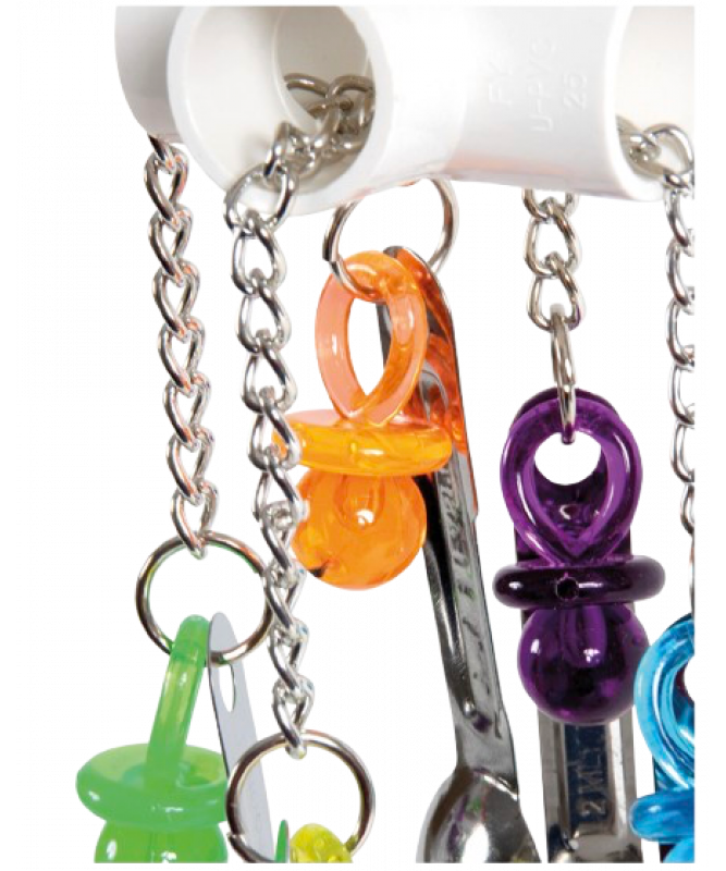Attached to the metal chains are colourful pacifier shaped beads, their bright colours reflect in the shiny surfaces, plus your Parrot is sure to have fun trying to find a way to remove them.